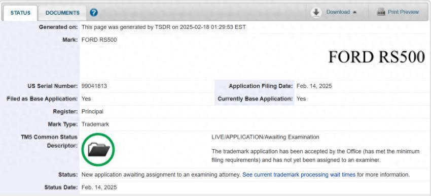 由于排放法规的限制,福特性能钢炮的代表作福克斯RS止步于第三代,目前只能由ST车型担任性能车型的重任。不过,最近福特在海外悄悄注册了"RS500"商标。虽然RS500的定位比RS更高,是性能旗舰车型,但目前尚不清楚这一商标将用于哪款车型。